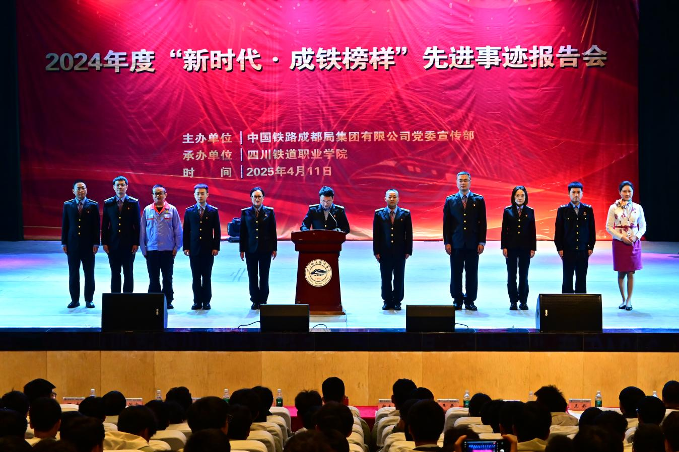 411日,为深入学习贯彻党的二十大精神,弘扬新时代铁路工匠精神,激励广大青年学子扎根铁路、建功岗位,beat365特邀中国铁路成都局集团有限公司2024年度“新时代·成铁榜样”宣讲团来校开展“奋进改革新征程、建功铁路现代化”主题宣讲活动。10名来自成都局集团不同岗位的先进榜样走进校园,为1400余名即将踏上铁路工作岗位的师生带来了一场震撼心灵的“精神盛宴”。