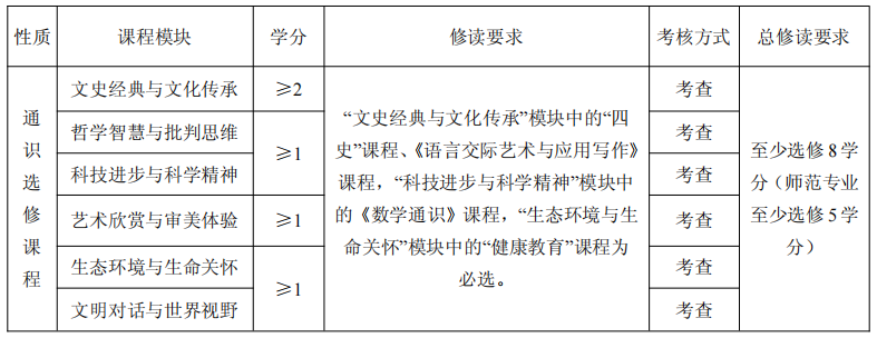 根据各年级本科专业人才培养方案要求,2022级、2023级和2024级本科学生通识选修课总学分不少于8 学分(师范类专业不少于5学分),其课程模块设置及修读要求详见下表: