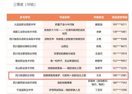 近日,由四川省教育厅指导、四川省教育融媒体中心(四川教育电视台)主办的“我的技能青春/我的职教人生”征文活动获奖名单公布。我院学子的作品从近千份来稿中脱颖而出,斩获佳绩。其中,李陈睿、宋光钊、邓渝、唐万山、刘龙飞同学的作品《用行动选择热爱 以脚步践行理想》荣获二等奖,文学同学的作品《技能铸就青春梦:互联网+创新创业之旅》荣获三等奖。