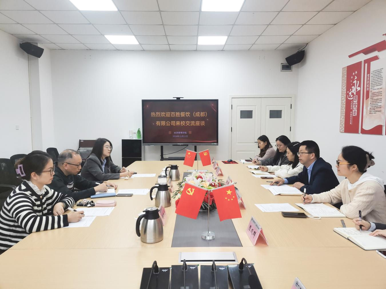 11 月 11 日上午,百胜餐饮(成都)有限公司人力资源副经理陈天相,连同肯德基招募经理胡怡、必胜客招募经理刘科秀一行莅临我院进行考察交流。学院党总支书记刘辉、副院长李晓陪同考察,教研室主任胡楚奇、专任教师代表陈双群以及辅导员代表罗雪冰、胡月参加座谈。