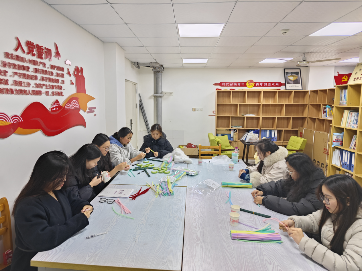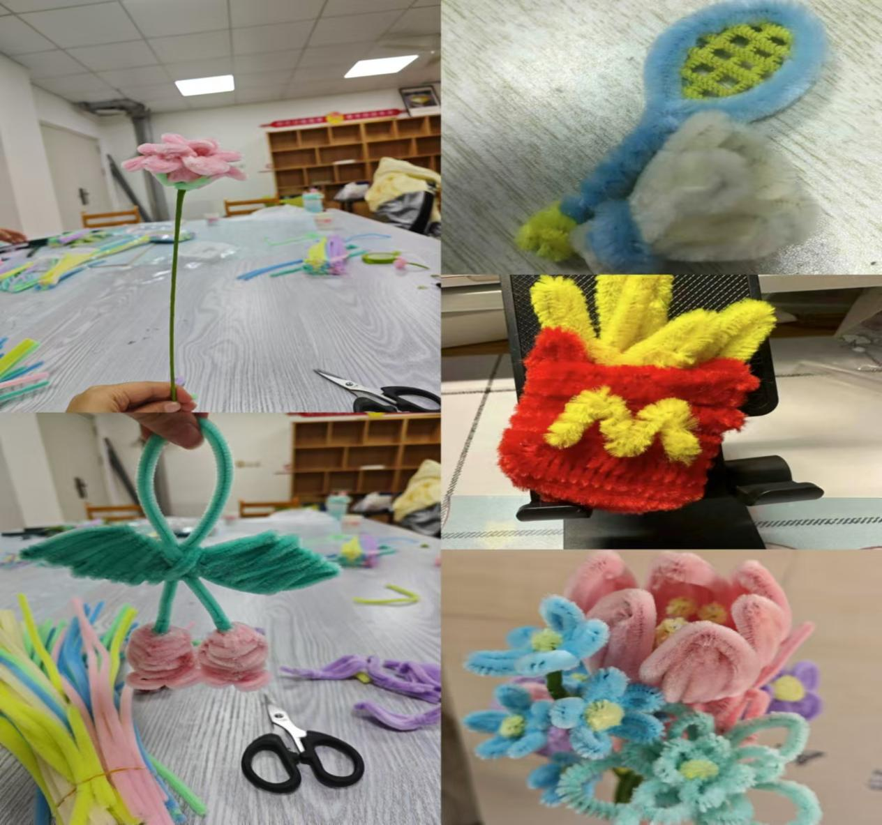 活动现场,五彩斑斓的扭扭棒材料一应俱全。同学们充分发挥自己的创造力和想象力,将一根根扭扭棒变成了精美的花朵、可爱的小动物和各种独具创意的小饰品。大家专注编织、沉浸其中,欢声笑语不断,在期末备考的紧张氛围中得到了精神放松和愉悦。