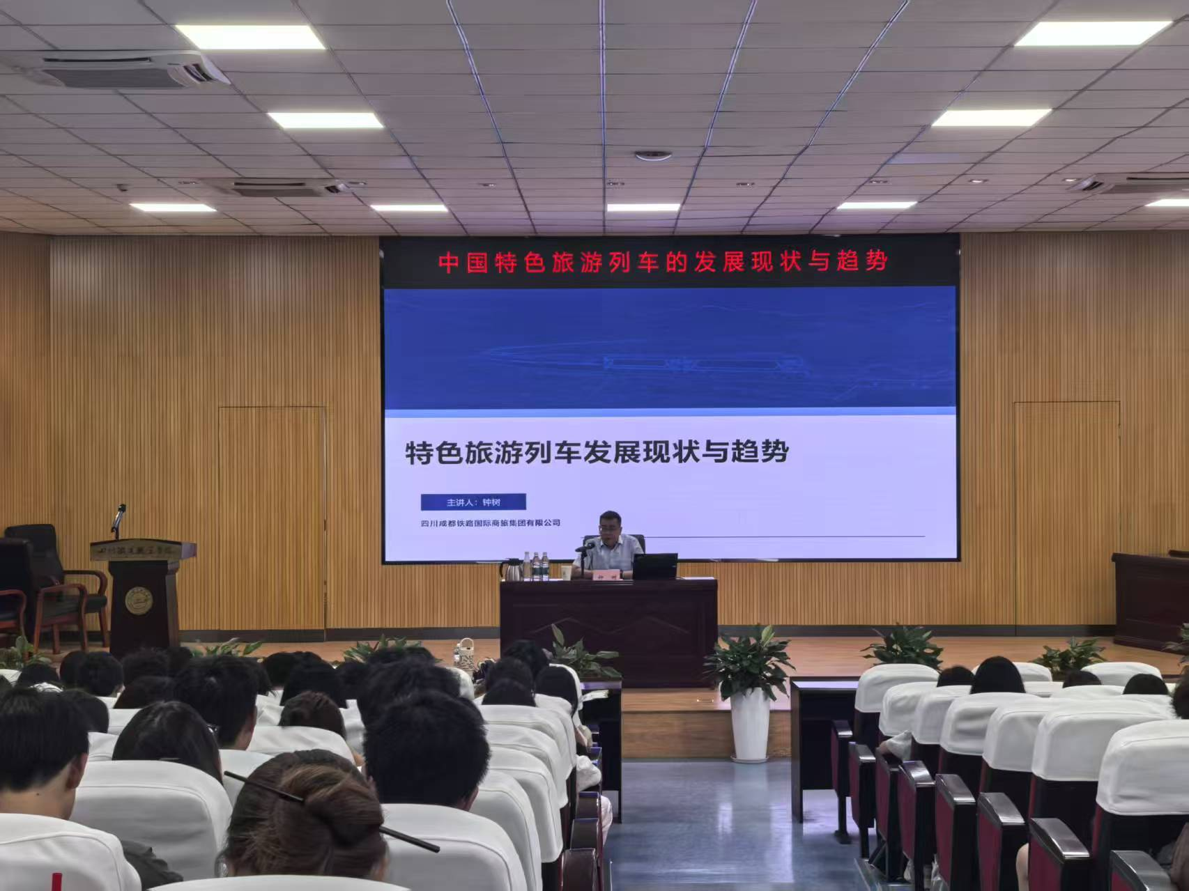 为深化产教融合,积极推进铁旅融合发展新路径,6 月 13 日下午,四川成都铁路国际商旅集团有限公司旅游管理部部长钟树受邀走进校园,以 “旅游列车发展现状与趋势” 为主题,为经济管理学院师生带来了一场专业讲座。作为学院精心策划的 “中国铁路系列讲座” 第一课,此次活动吸引了 200 余名师生到场,学习氛围热烈。