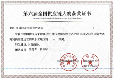 2025年6月22日,全国第六届供应链商贸供应链运营大赛在江苏商贸职业学院圆满落下帷幕。经济管理学院教师何弘玙、檀晓琳组成的“供赢者”团队,以及由胡楚奇、杜林烨组成的“供胜者”团队凭借扎实的专业知识、出色的团队协作和稳定的赛场发挥,在183支参赛队伍中脱颖而出,取得了两项职工组二等奖的优异成绩。同时,由袁海霞、杨曦、杨璐瑶、蓝静组成的学生团队在406支参赛队伍中脱颖而出,取得了三等奖的优异成绩,充分展现了我院在供应链管理领域人才培养的实力与风采。