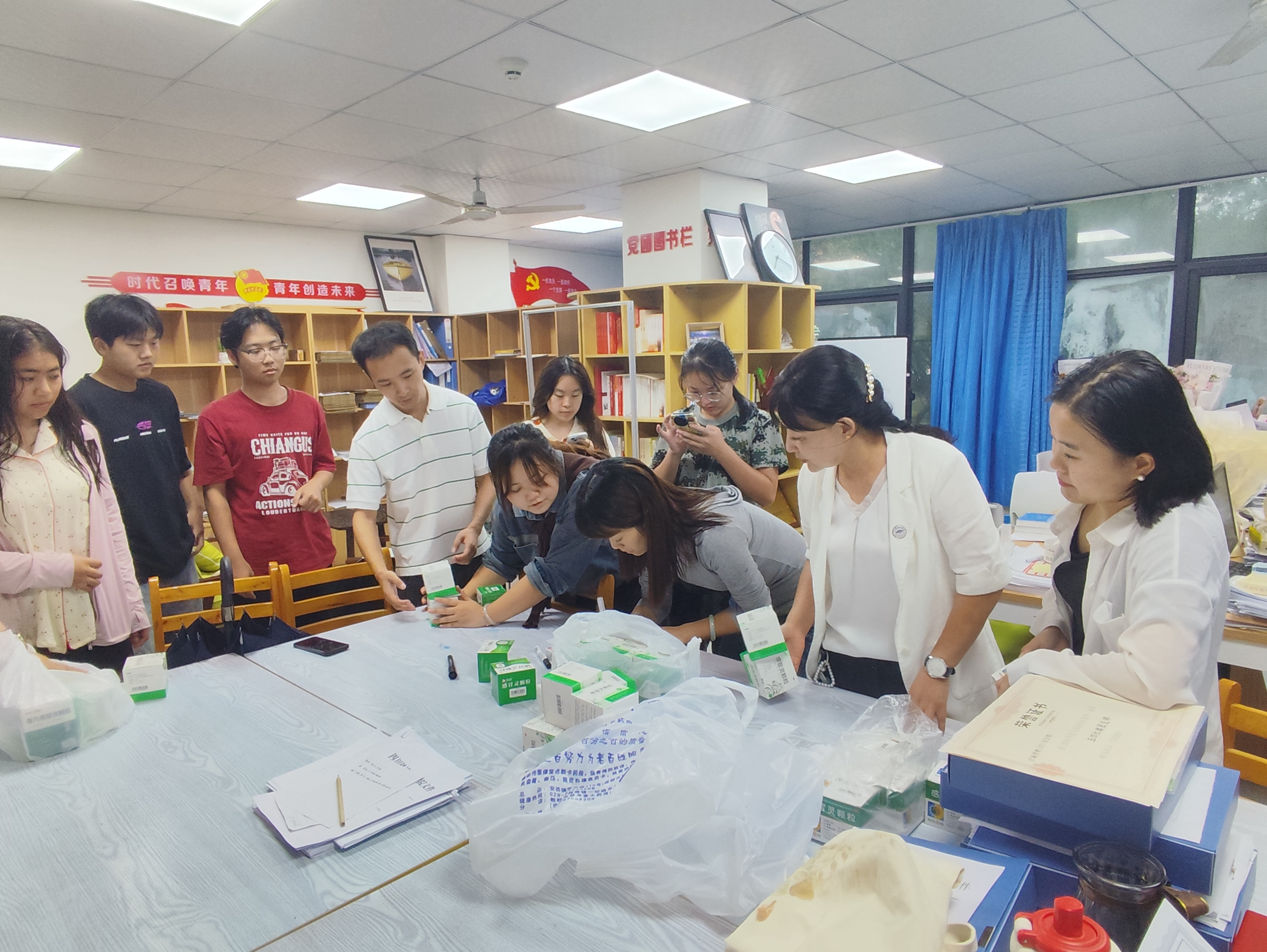 经济管理学院党总支书记、院长文容和辅导员老师第一时间行动起来,紧急采购感冒灵冲剂,组织发放至各新生班级,确保每位新生都能及时领取到预防药品。
