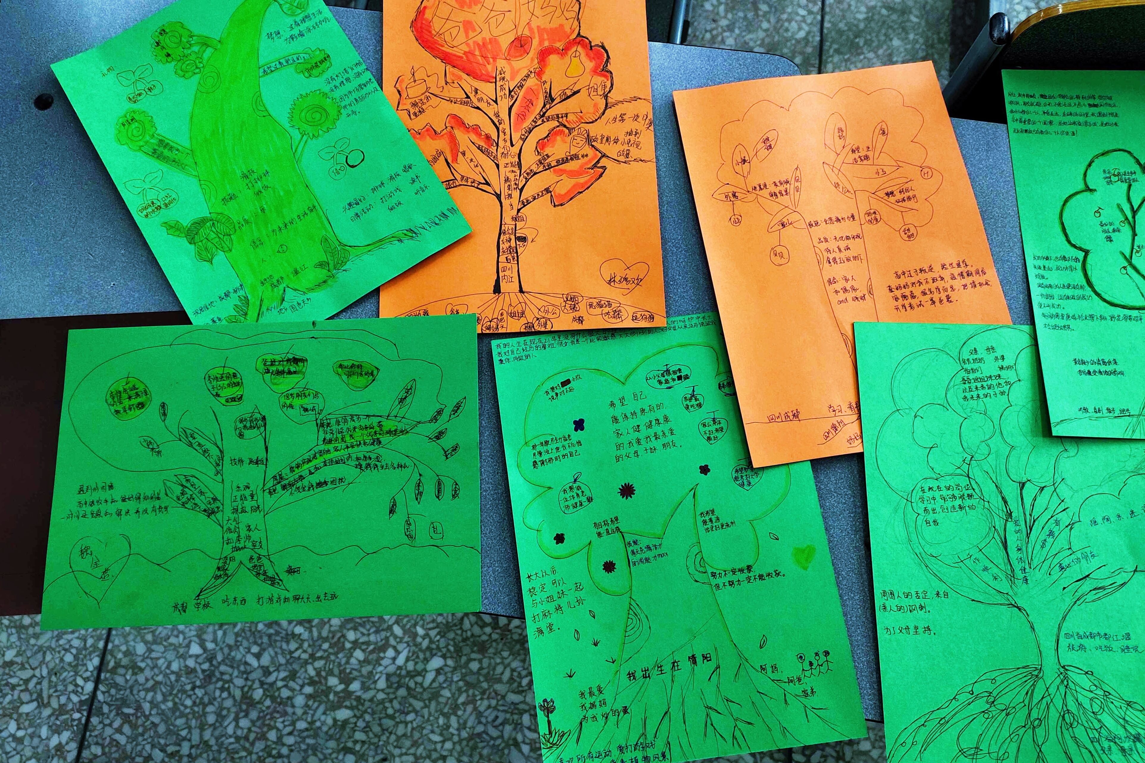 班级心理委员作为领导者组织班级同学完成“生命树”。由最开始的破冰行动询问同学们对于树的回忆以及故事,引导同学们对主题有所了解,然后开始共植生命树,从树根、地面、树干、树枝、树叶、果实,最终成为一颗颗大树,在绘画过程中,邀请同学们进行分享自己的大树组成部分。当暴风雨来临时,让同学们在空白处写下自己遇到过的困境和解决的办法以及感想,让同学们对于困境产生不畏惧不怕的心理,最后将同学们一颗颗的生命树粘贴在黑板上组成不会孤独的森林,让同学们意识到团结以及对困难的不畏惧。