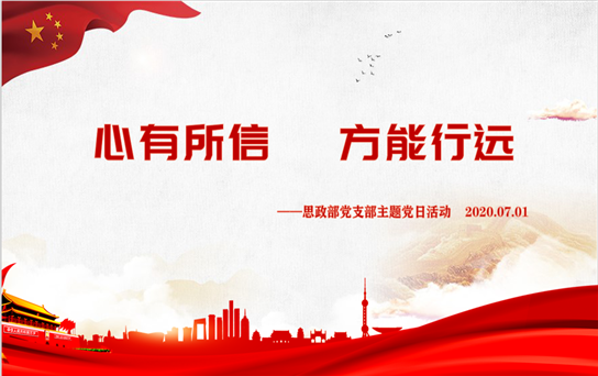 7月1日,在喜迎中国共产党成立99周年之际,思政部党支部全体党员同志在支部书记朱红同志的主持下,在思政部2404办公室开展了“心有所信 方能远行”主题党日活动,集体学习了习近平总书记给复旦大学《共产党宣言》展示馆党员志愿服务队全体队员的回信。党员同志们认真学习,结合本职岗位畅所预言,纷纷表示,要认真领会“回信”精神,在学思践悟中坚定理想信念,在奋发有为中践行初心使命,以饱满的热情、担当的精神全身心投入到立德树人,培根铸魂,育民族复兴新人的工作之中。
