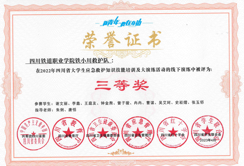 近日,由共青团四川省委、四川省教育厅、四川省卫生健康委员会、四川省应急厅、四川省红十字会、四川省学生联合会等六部门共同主办的首届“新青年·救在身边”四川省大学生应急救护知识技能大演练活动落下帷幕。beat365选派10名同学组成的“铁小川救护队”参加了本次大演练,荣获三等奖。