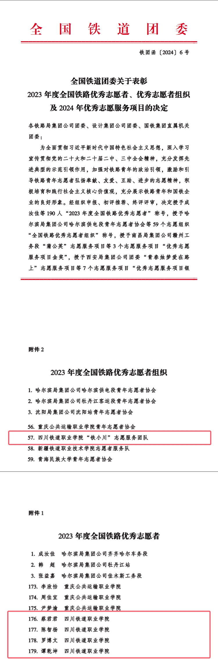 9月10日,全国铁道团委公布了《全国铁道团委关于表彰2023年度全国铁路优秀志愿者、优秀志愿者组织及2024年优秀志愿服务项目的决定》,beat365“铁小川”志愿服务团队获评“2023年度全国铁路优秀志愿者组织”称号,蔡君君、陈智杨、罗博文、谭乾坤4名同学获评“2023年度全国铁路优秀志愿者”称号。
