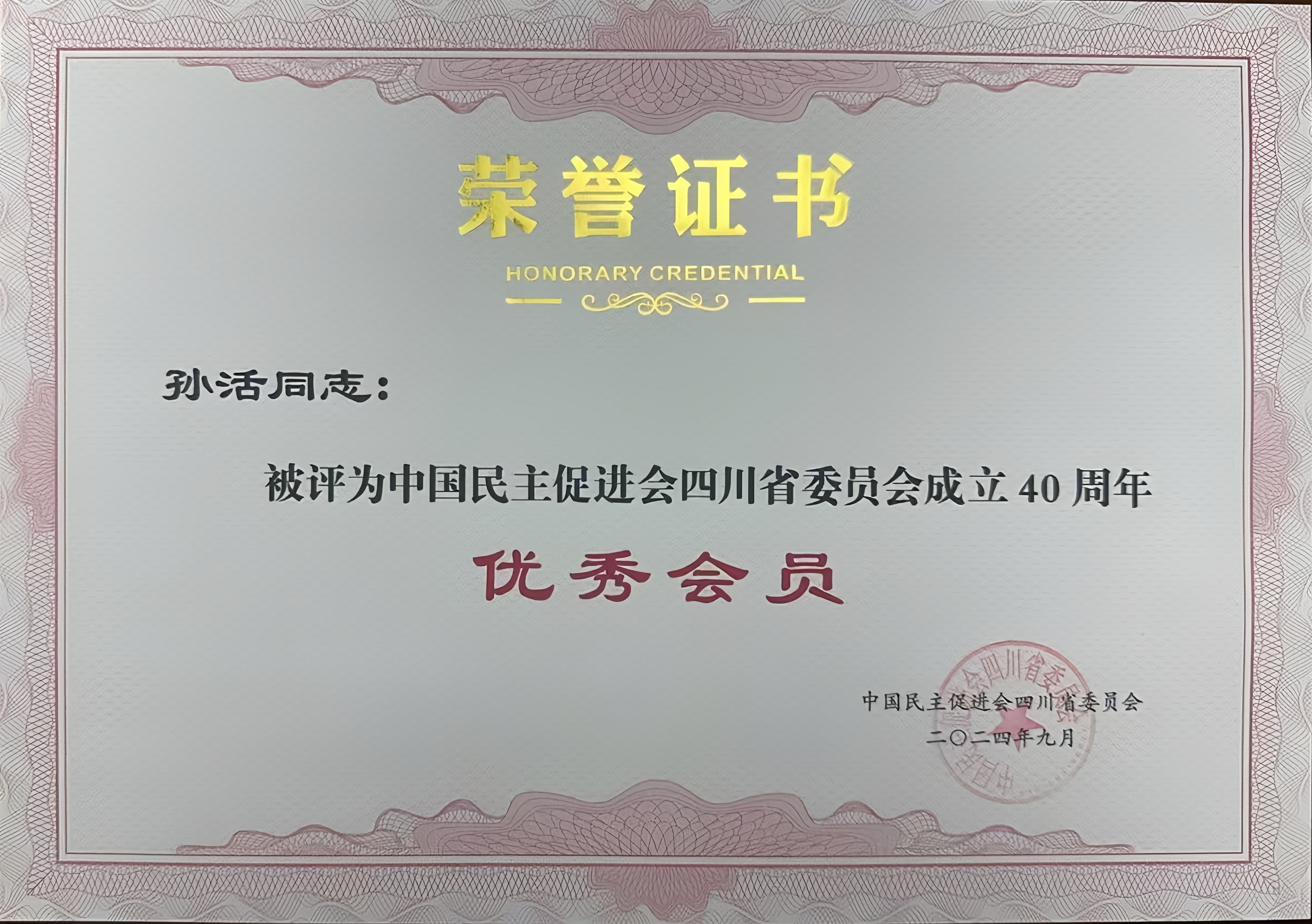 会上,民进四川省委会副主委、成都市委会主委杨建德宣读了《关于表彰民进四川省委会成立40周年优秀会员的决定》,beat365民进会员孙活被授予民进四川省委会成立40周年优秀会员称号。