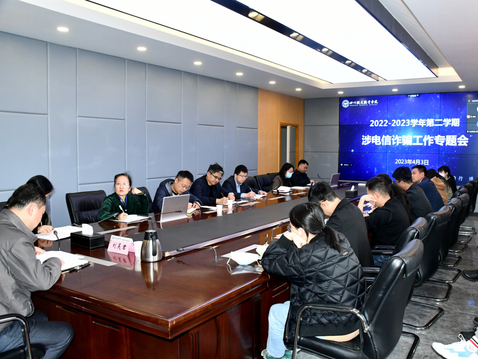 为加强平安校园建设,提高广大师生识骗、防骗能力,遏制学生涉电信网络诈骗案件的发生,4月3日上午,学校在第五会议室召开学生群体涉电信诈骗专题会议,深入分析了当前面临的严峻形势,对下一步工作进行了安排部署。会议由党委副书记刘昊君主持。