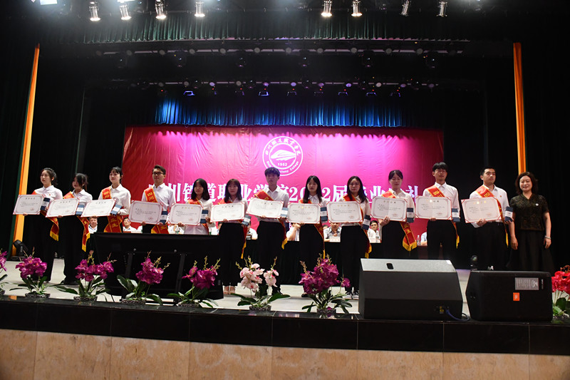 典礼上还宣读了《2022届四川省级优秀毕业生认定结果》《关于表彰2022届校级优秀毕业生的决定》等文件。校长赖芳为2022届毕业生代表颁发毕业证书,为优秀毕业生代表颁发荣誉证书。毕业生们结合传统礼仪,以谢师恩的方式向全体老师表达敬意。