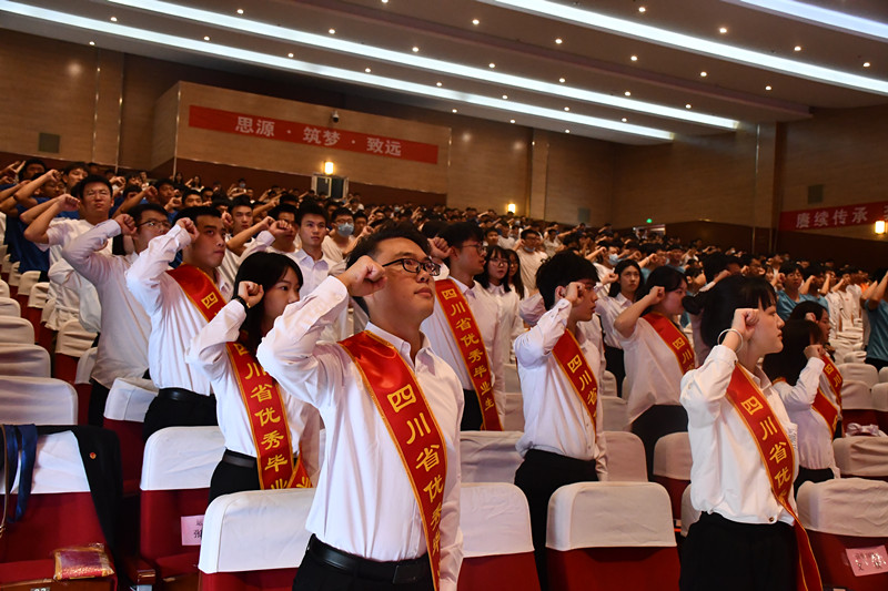 毕业生代表石清以“初识、成长、追光”为线索分享了自己的奋斗故事,并代表全体毕业生向母校和老师们表达了感恩、祝福之情。毕业生代表深情地朗诵《致敬我亲爱的母校》,用质朴的语言、饱满的精神真情告白母校,倾诉着对川铁的感恩与怀念,表达着对师长的感激与不舍,满怀崇敬向母校致以青春礼赞,饱含深情对母校许下青春诺言。在全体领导和老师的见证下,肖玉滢同学带领全体毕业生面向国旗庄严宣誓,立志不负母校期盼,勇为社会栋梁,争做大国工匠。