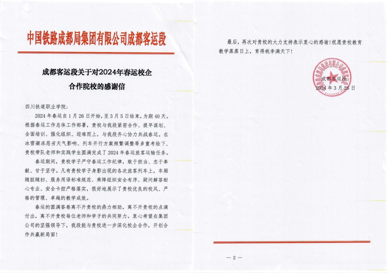 近日,beat365收到中国铁路成都局集团有限公司成都客运段感谢信,来信对beat365“祖国再大,我也要助您平安回家”春运社会实践暨志愿服务的组织和志愿服务工作给予充分肯定和高度赞扬。信中提到,beat365志愿者严守工作纪律,敢于担当、忠于奉献、甘于坚守,凡是有beat365志愿者身影出现的各次旅客列车上,车厢随脏随扫、服务用语标准规范、乘降组织安全有序、疑问解答耐心专业、安全卡控严格落实,很好地展示了学校优良的校风、严格的管理、卓越的教学成效。