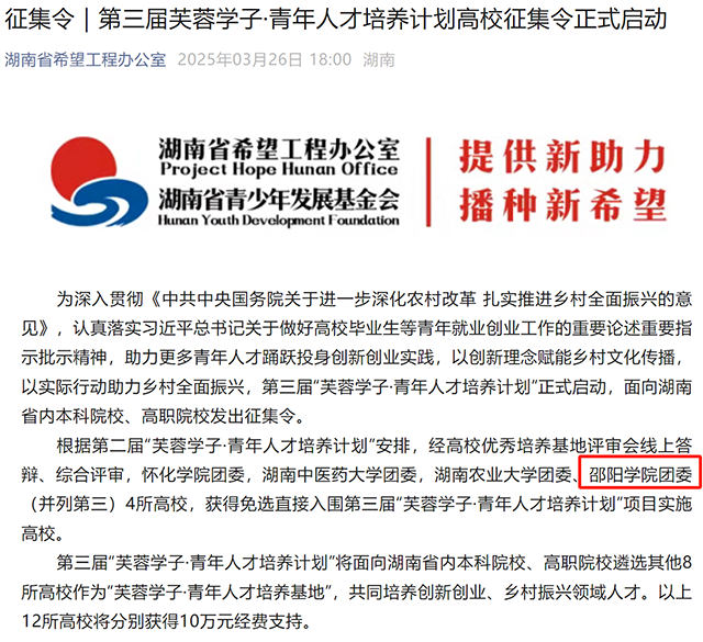 近日,第三届“芙蓉学子·青年人才培养计划”正式启动,面向湖南省内本科院校、高职院校发出征集令。根据第二届“芙蓉学子·青年人才培养计划”安排,经高校优秀培养基地评审会线上答辩、综合评审,开云官网提交的开云kaiyun官方网站乡村振兴工作站“青创兴乡”青年实干家培养计划,免选直接入围第三届“芙蓉学子·青年人才培养计划”项目实施高校,并获得10万元经费支持。