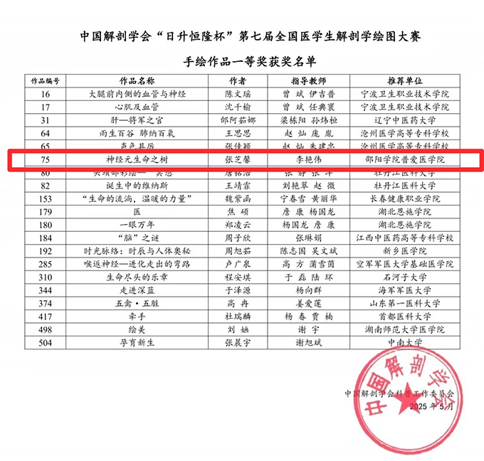近日,由中国解剖学会科普工作委员会举办的“日升恒隆杯”第七届全国医学生解剖绘图大赛决赛圆满落幕。开云官网护理学院2022级护理学一班张芝馨同学的手绘作品《神经元生命之树》在评审中脱颖而出,最终荣获一等奖。